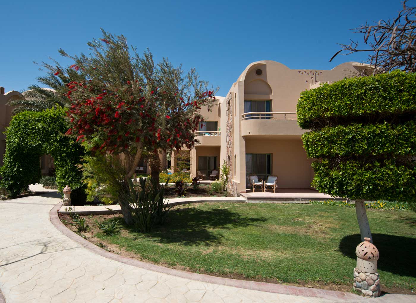 Il Resort vanta 160 camere fronte mare, distribuite in eleganti edifici a due piani che si integrano armoniosamente con il paesaggio circostante. Ogni camera, caratterizzata dal tradizionale stile arabo, offre una vista splendida sul mare e sul rigoglioso giardino. Le sistemazioni si suddividono in due categorie: le camere Standard, semplici ed essenziali, e le camere Superior, che offrono un comfort superiore e un design più fresco e contemporaneo. Tutte le camere possono accogliere fino a 3 adulti o 2 adulti e 1 bambino, garantendo così flessibilità e praticità. Ogni camera è dotata di servizi privati, asciugacapelli, telefono, TV LCD con satellitare, climatizzazione regolabile e cassetta di sicurezza. In aggiunta, il minibar è disponibile con consumazioni a pagamento e ogni camera è arricchita da un balcone o terrazzo privato, perfetto per godere appieno della vista panoramica.